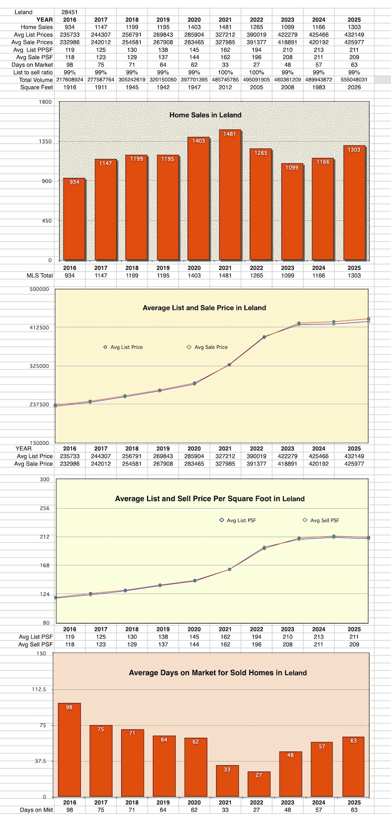 Leland area has much more available space to build on, so it has seen a more steady ten year increase in home sales. Prices have also been going up steadily.