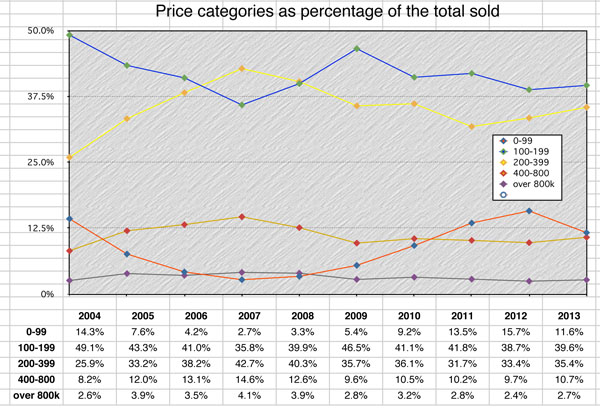 This chart shows the trends in sales by price category. For example, 39.5% of sales were in the 100 - 199k price range. After gains in recent years, the under 99k price category fell last year to 11.5% of total sales. The 200 - 400k price ranges make up for about 75% of the total market. |
