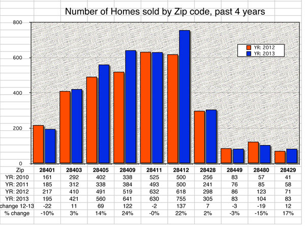 This chart shows the homes sales over the past four years by zip code. The chart shows the past two years, blue represents sales in 2013 and red represents sales in 2012. (the data below it shows all four years). The bottom line shows the percentage difference between 2011 and 2012. Sales in 28401 and 28480 were off 10 - 15%, while sales in 28409 and 28412 were up 22 - 24%. |