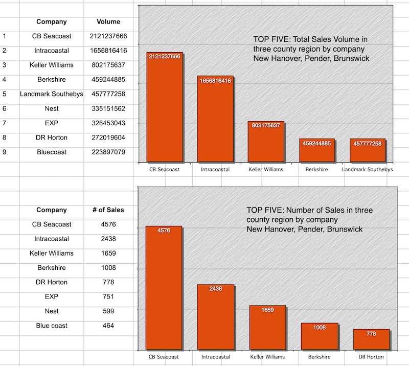These charts show leading real estate companies in the area. Coldwell Banker Sea Coast has had more sales and more volume in the region for well over 20 years.