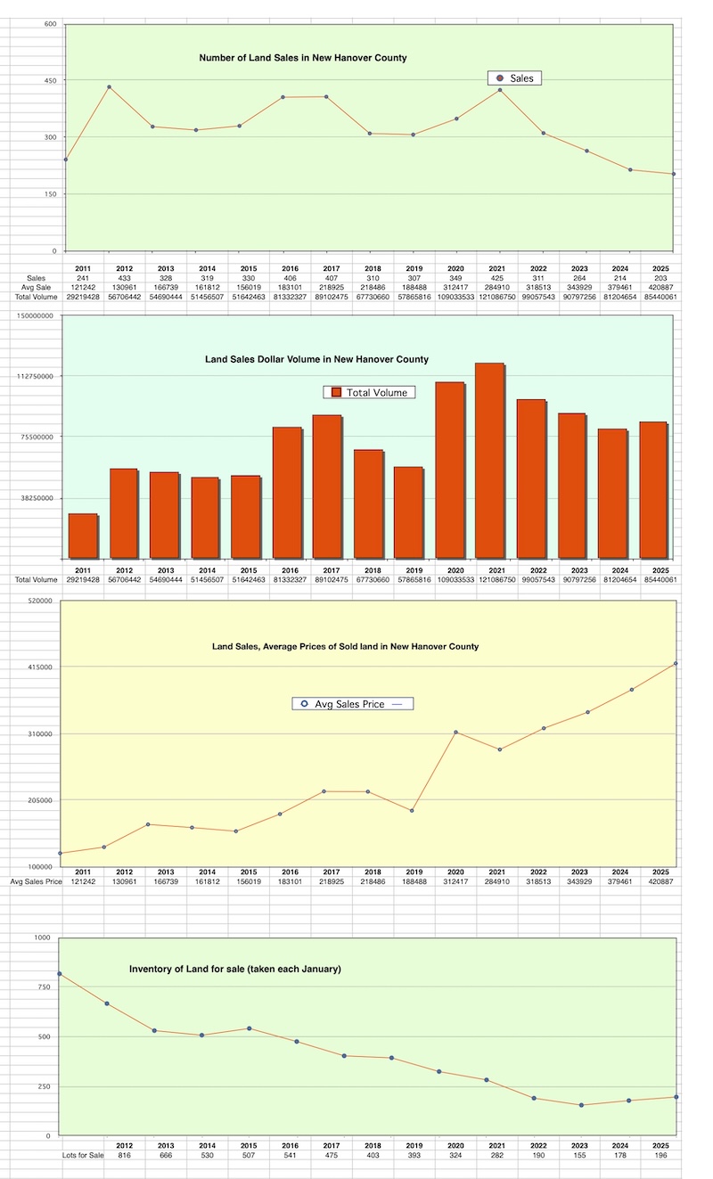 This chart shows the land sales activity from past years. The roller coaster ride of land sales peaked in 2004 at nearly 1000, then dropped steadily to 127 in 2009. Since then it has been on a steady rise, though it did drop last year. Prices have been rising the last few years. Inventory has fallen steadily over the past four years.